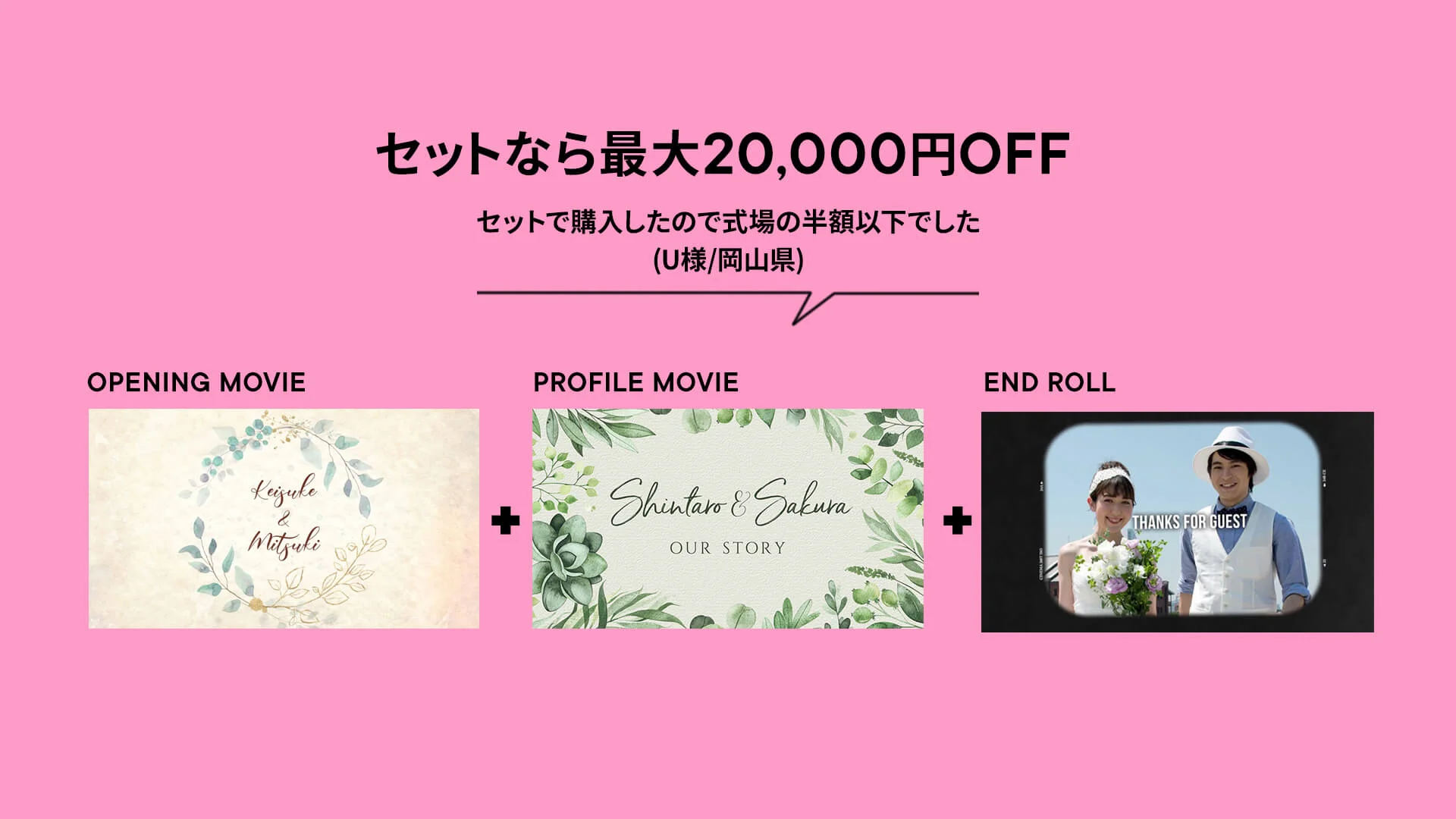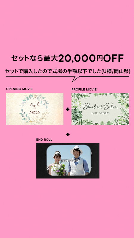 AMAZINGオープニングムービー写真をたくさん使いたい2人にぴったりのスタイリッシュなオープニングムービー。通常価格:43,780円(税込)セール価格:16,800円(税込 18,480円) FLOWERオープニングムービーカラフルで爽やかなオープニングムービー。まるでCMのようなクオリティーです。通常価格:38,280円(税込)セール価格:13,800円(税込 15,180円)